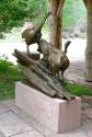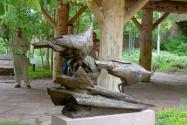 Skip to main contentDescriptionSculpture of wild turkeys standing on a piece of bark at various heights.