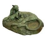 Skip to main contentDescriptionAmerican Panther lying on her right side with two cubs in center being groomed. Irregular oval base. Electrotype casting.