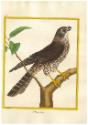 DescriptionHand colored engraving of a Merlin (Falco Columbarius) standing on a tree branch, facing right with leaves in the background. Red ink marks along top, bottom, and right edges.