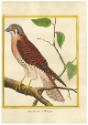 Skip to main contentDescriptionHand colored engraving of an American Kestrel (Falco Sparverius) standing on a tree branch, facing left with leaves in the background.