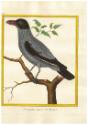 DescriptionHand colored engraving of a Black Tailed Tityra (Tityra Cayana) standing on a tree branch, facing left with leaves in the background.
