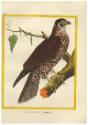 Skip to main contentDescriptionHand colored engraving of a Barbary Falcon (Falco Pelegrinoides) standing on a tree branch, facing right with leaves in the background.