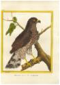 DescriptionHand colored engraving of a Roadside Hawk (Rupornis Magnirostris) standing on a tree branch, facing right with leaves in the background.