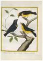 Skip to main contentDescriptionHand colored engraving of three birds. The far left bird is a Golden-Sided Euphonia (Euphonia Cayennensis) standing on a branch, facing right. The top right bird is an Orange-Bellied Euphonia (Euphonia Xanthogaster) standing on a tree branch, facing left. The bottom right bird is a Violaceous Euphonia (Euphonia Violaceo) standing on a tree branch, facing left.