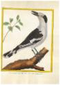 DescriptionHand colored engraving of a Hook-Billed Vanga (Vanga Curvirostris) standing on a tree branch, facing right with head turned and vegetation in the background.